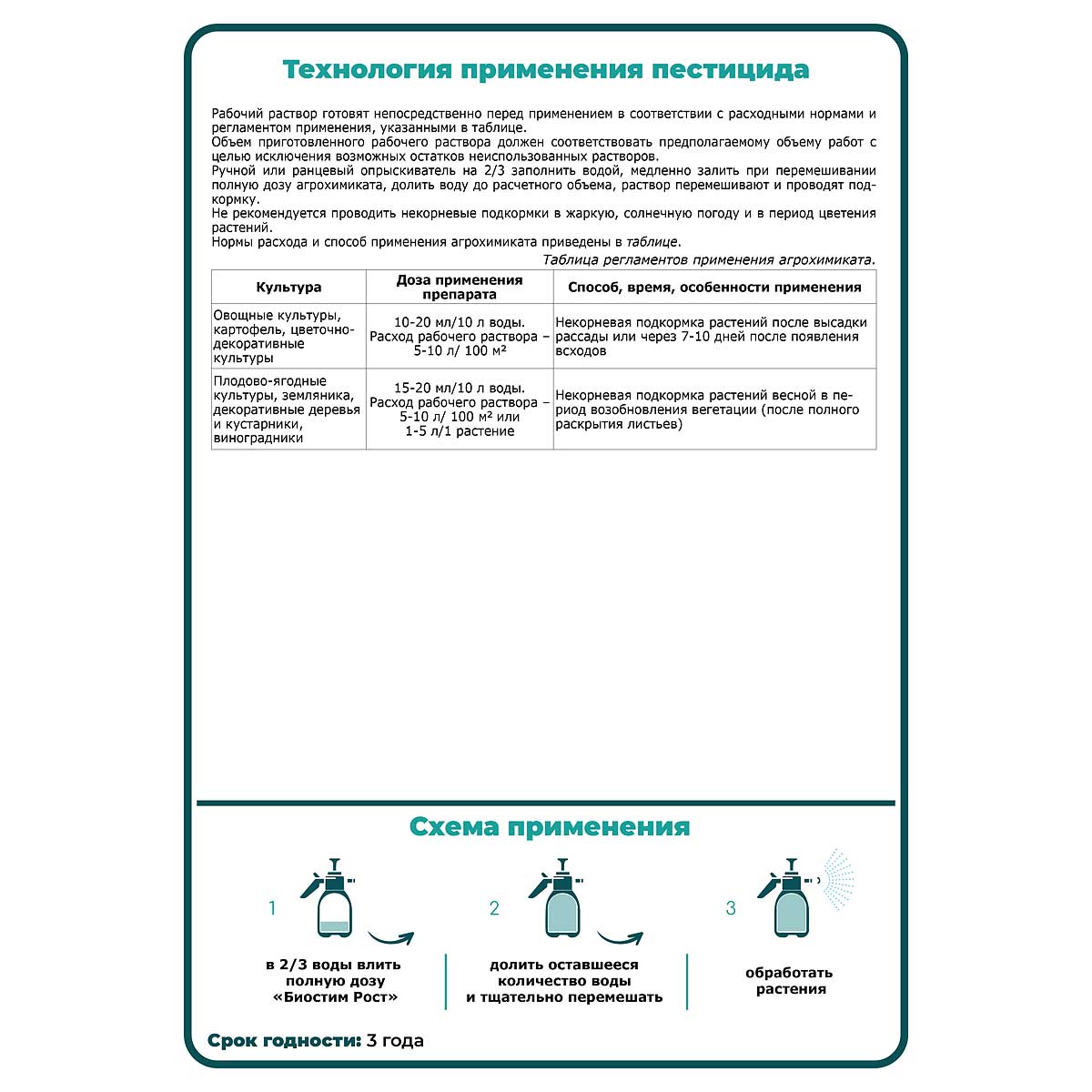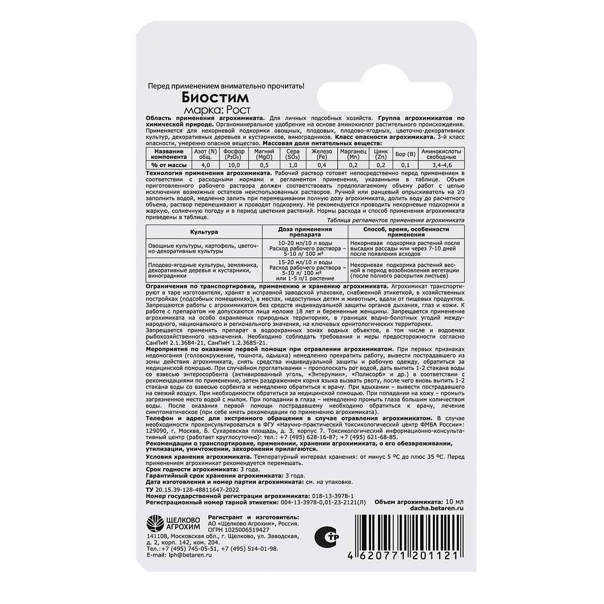 «Биостим Рост» увеличивает урожайность и ускоряет созревание плодов. Препарат состоит из биологически активных ингредиентов: комплексов аминокислот, полисахаридов, макро- и микроэлементов. Урожайность растёт за счёт ускорения деления клеток растений. Препарат обеспечивает быстрое поступление питательных веществ в растение через листья, насыщает биологически активными веществами, активизирующими жизненную энергию и рост растений в неблагоприятных погодных условиях