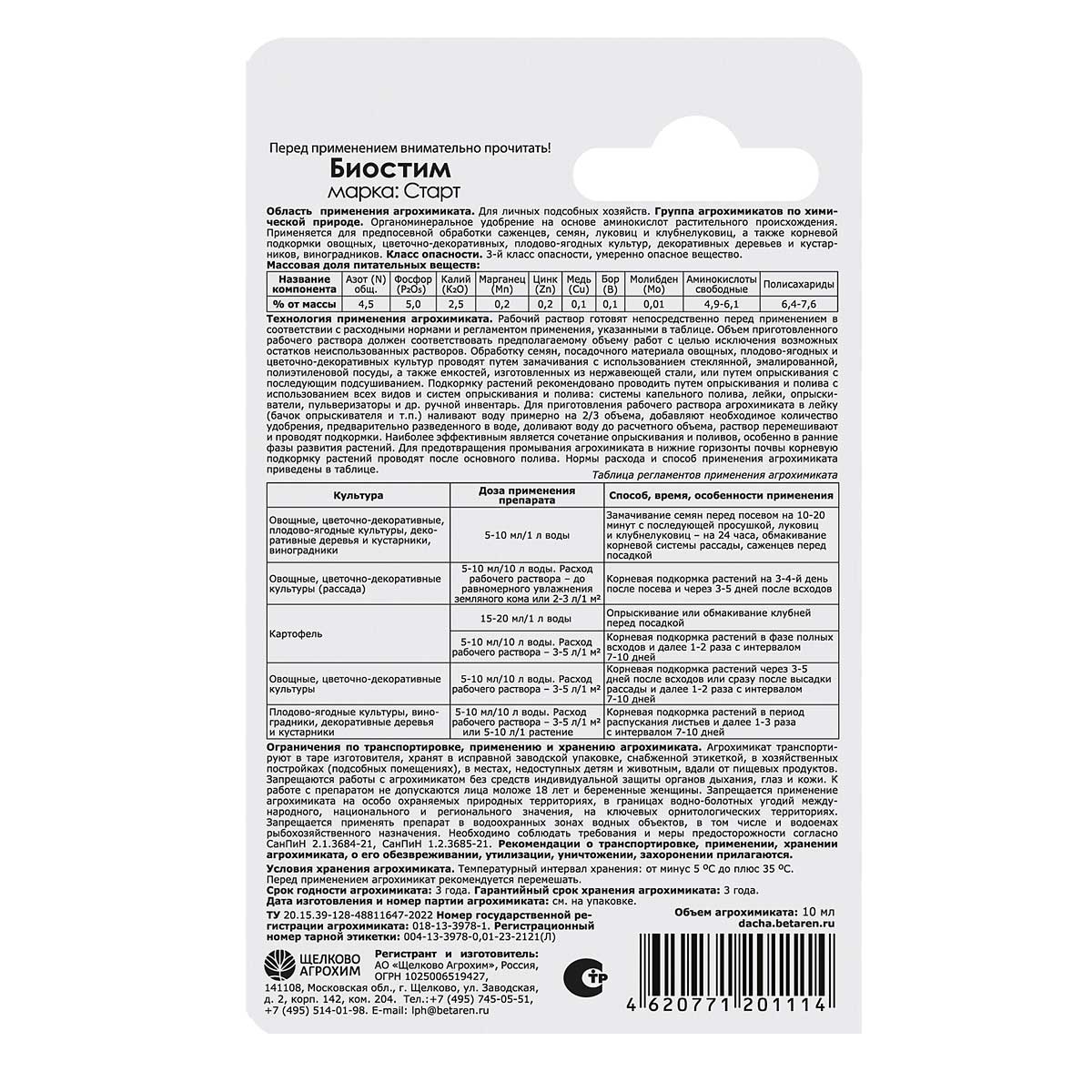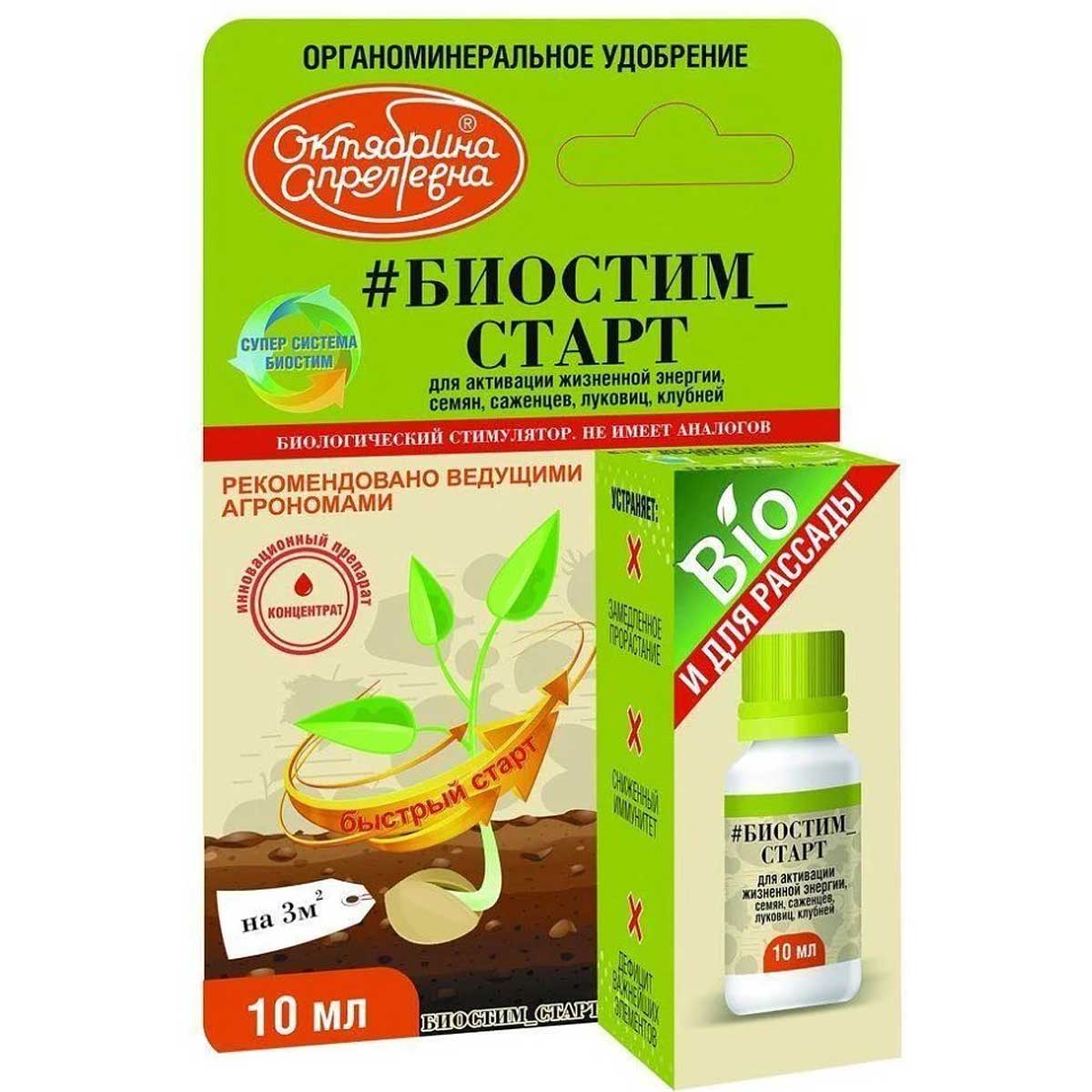 Препарат «Биостим Старт» предназначен для для активизации жизненной энергии семян, саженцев, луковиц, клубней. Препарат состоит из биологически активных ингредиентов: комплексов аминокислот, полисахаридов, макро- и микроэлементов. Обработанные этим препаратом семена быстрее и дружнее прорастают, поскольку компоненты препарата становятся дополнительным источником энергии. Ростки получают от «Биостим Старт» на начальном этапе развития все необходимые питательные вещества.
