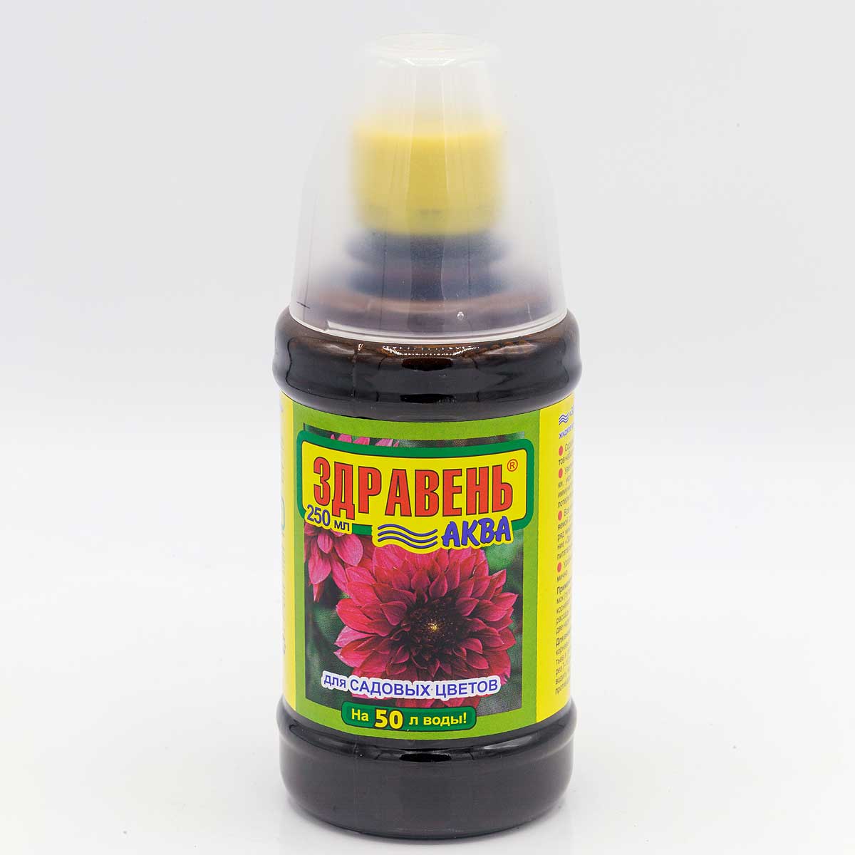 Здравень аква — жидкое комплексное органоминеральное удобрение для корневой и некорневой подкормки садовых цветов в личных подсобных хозяйствах. Содержит оптимальный для подкормки садовых цветов набор макро- и микроэлементов. Не содержит хлора.