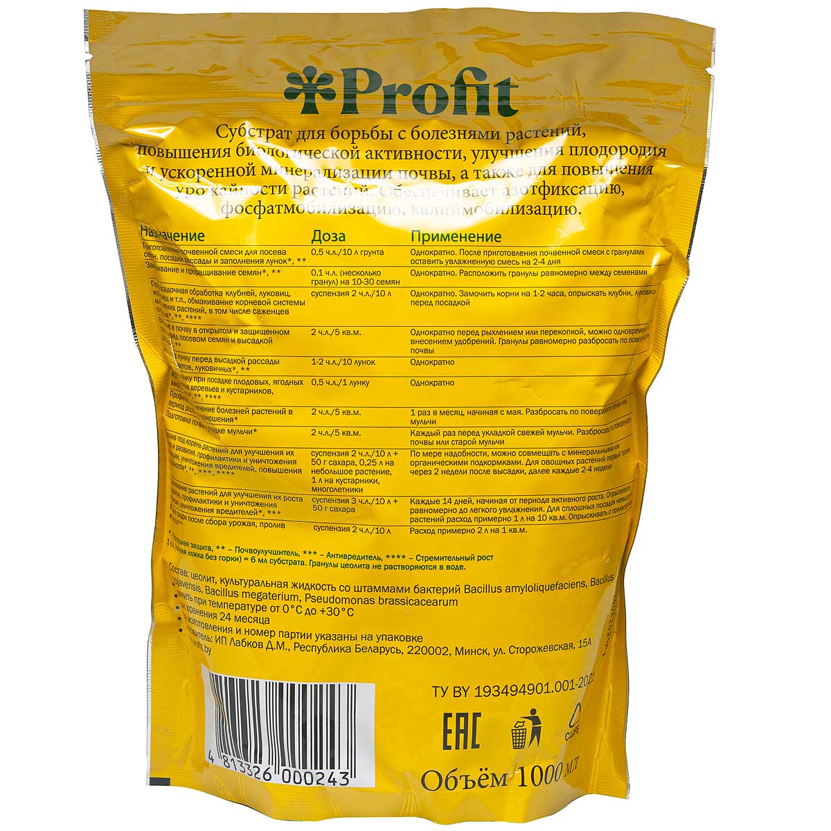 Субстрат для повышения урожайности овощных, зерновых и плодовых культур, улучшения фитосанитарного состояния посевов, повышения биологической активности почв, восстановления ослабленных и обедненных почв. Применяется путем добавления гранул в лунки при высаживании, пролива уже высаженных растений на глубину залегания корней, пролива во время вегетационного периода и после уборки урожая.