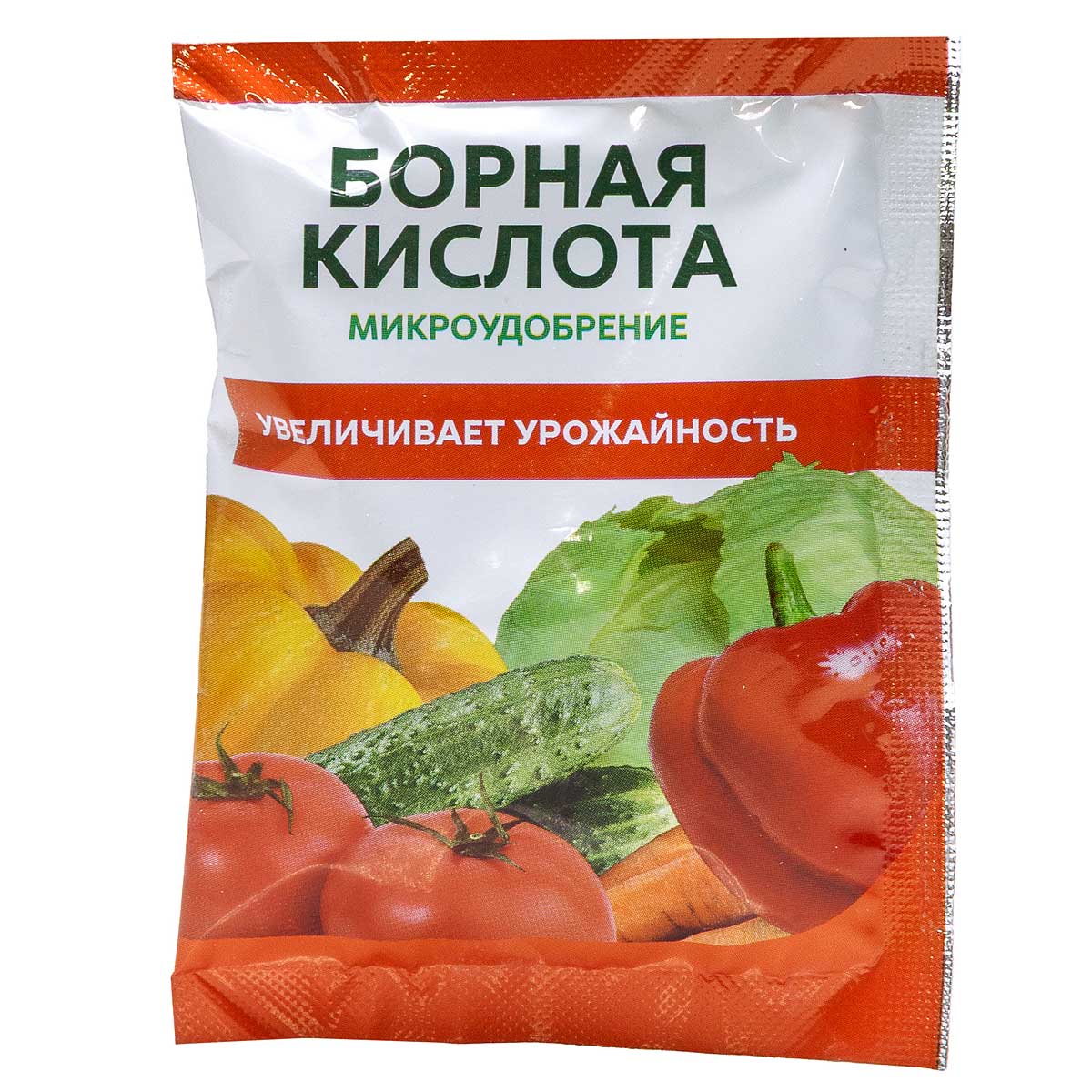 Борная кислота универсальное микроудобрение применяется при дефиците бора в почве. Препарат противодействует отмиранию точек роста - стеблей и листьев, способствует увеличению содержания сахара, витамина С и каротина в плодах.