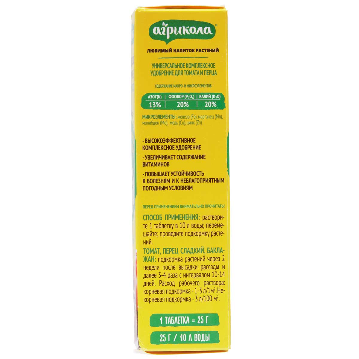 Удобрение Агрикола для томатов в форме шипучих таблеток- высокоэффективное комплексное удобрение,которое увеличивает содержание витаминов и повышает устойчивость к болезням и к неблагоприятным погодным условиям.В состав средства входит азот,фосфор,калий и такие микроэлементы, как железо,марганец,молибден,медь и цинк.Любимый напиток растений будет огромной помощью для садоводов и огородников. Удобрение подходит для томатов,перцев и баклажанов. Назначение удобрения-стимуляция роста и питание, укрепление иммунитета растений. Одна компактная таблетка рассчитана на приготовление 5 литров питательного раствора,это оптимальный объем для разовой подкормки нескольких растений, что позволяет экономно расходовать удобрение и не готовить лишний раствор. При погружении в воду таблетка быстро растворяется, образуя равномерно насыщенный раствор без осадка и комков. Эта особенность обеспечивает точную дозировку питательных веществ, исключая возможность ожога корневой системы из-за неравномерной концентрации. Удобрение обладает рядом преимуществ: